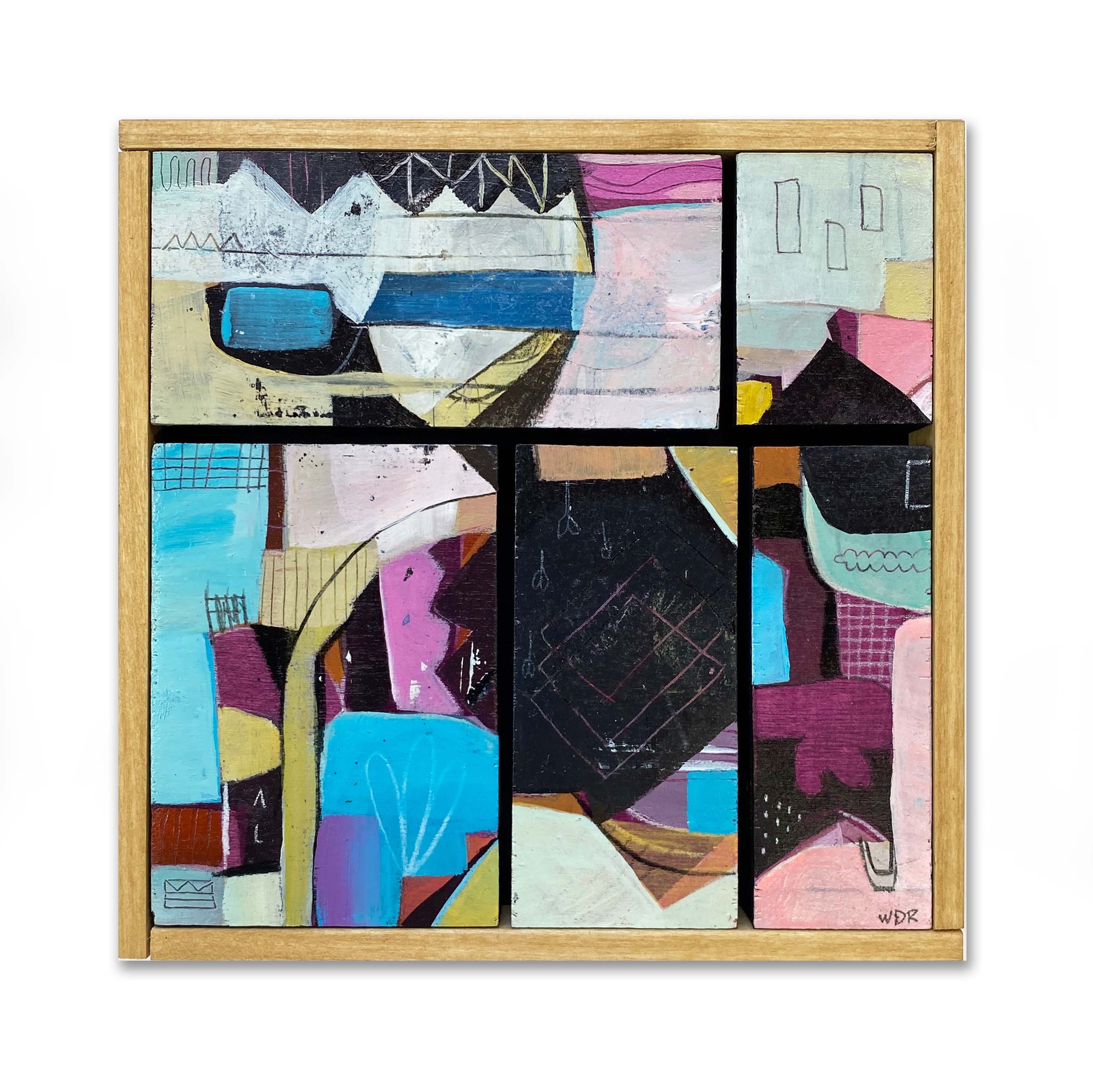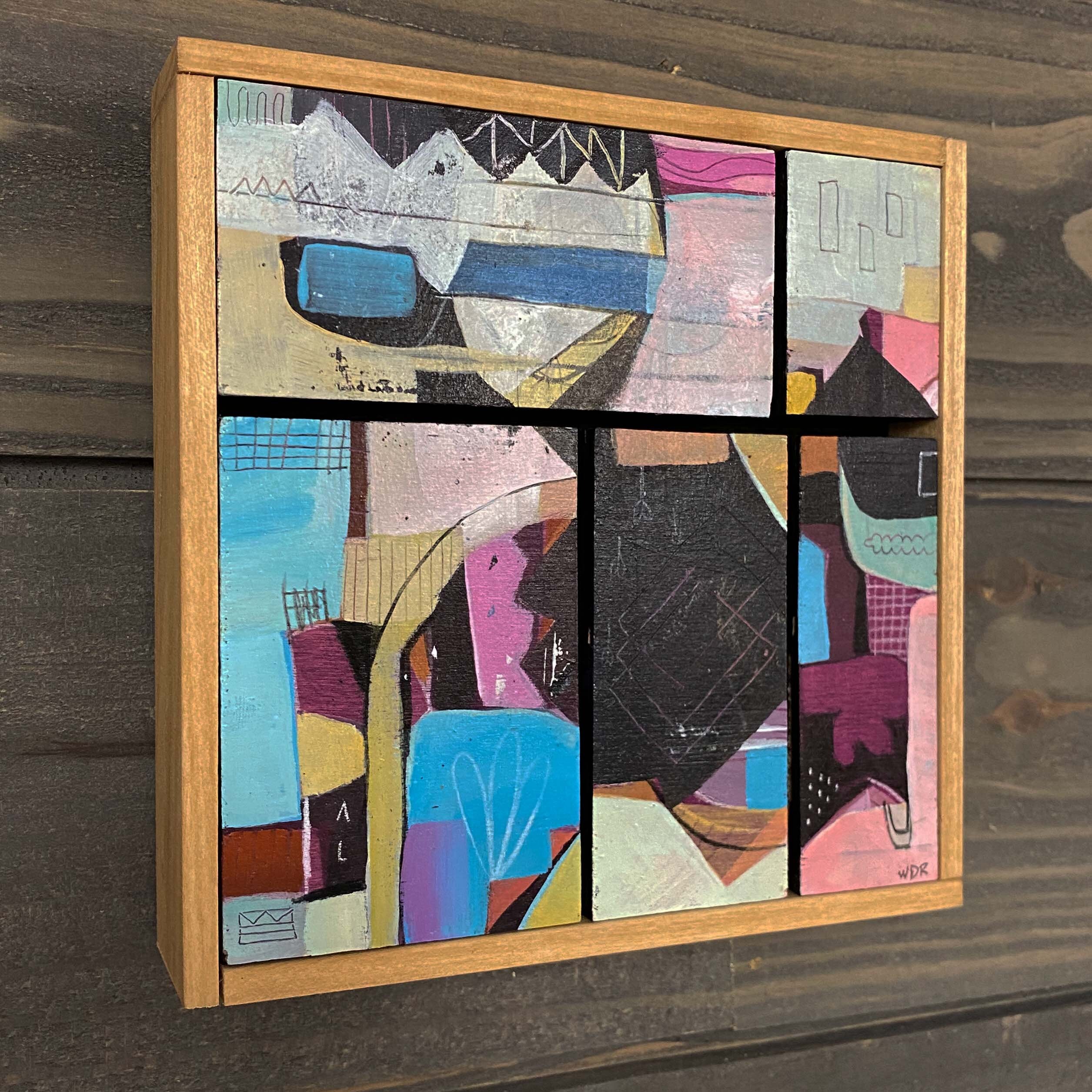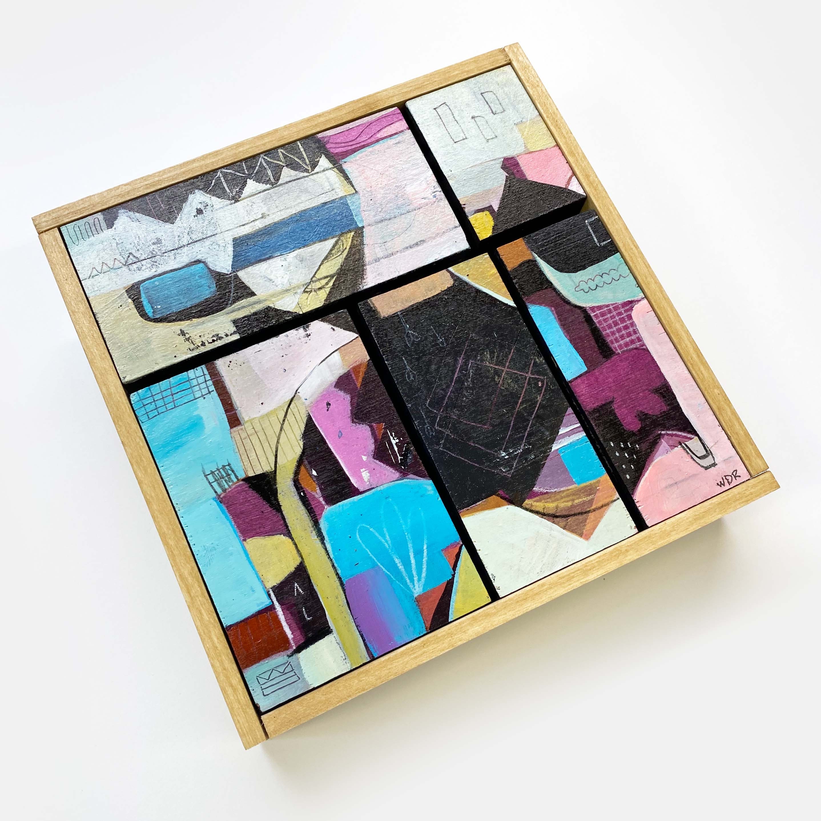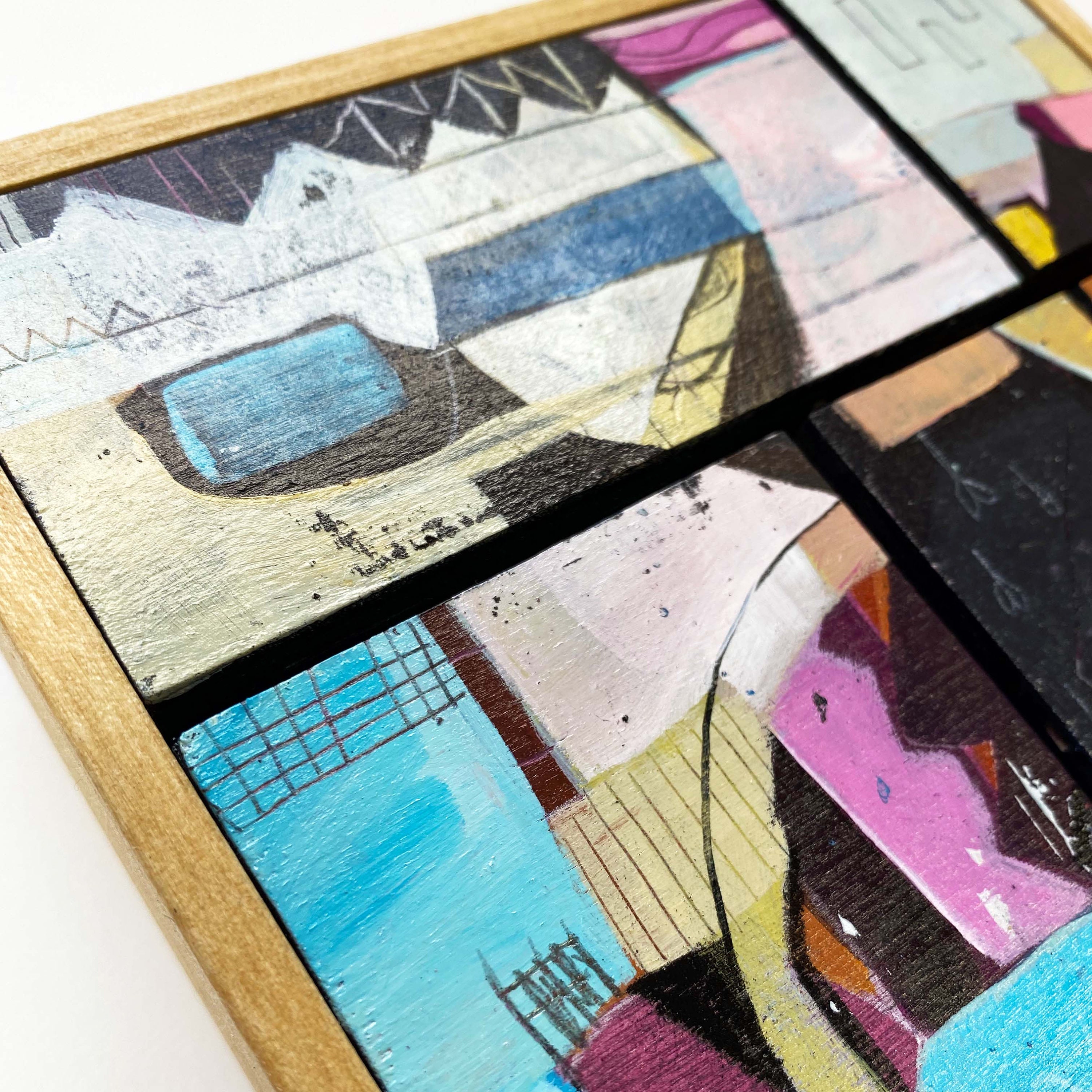 Original acrylic painting on wood blocks mounted on 6" x 6" on wood panel with slated frame.