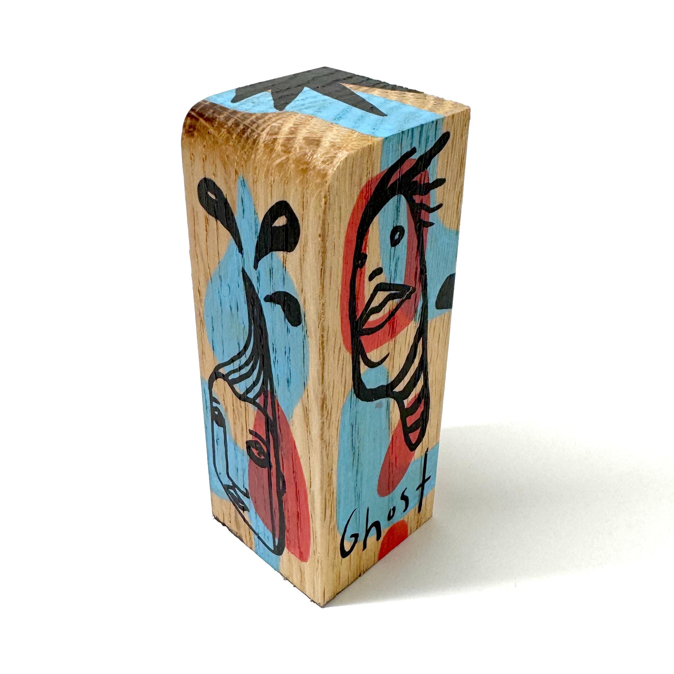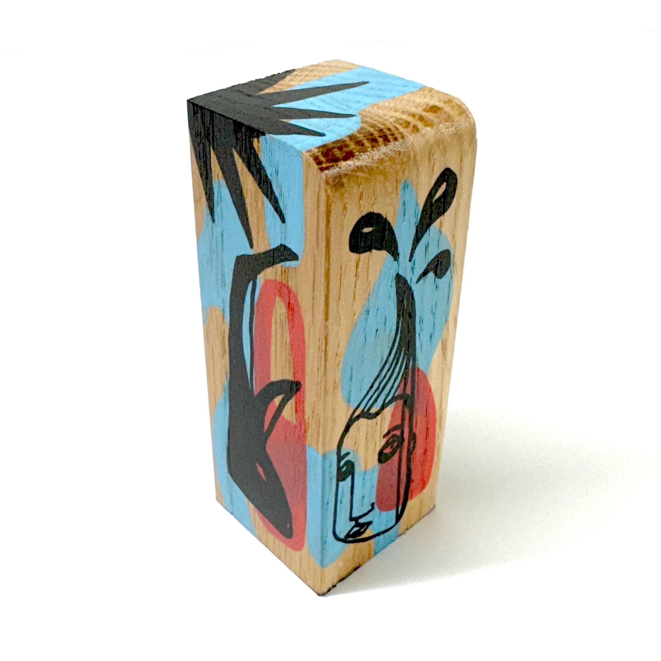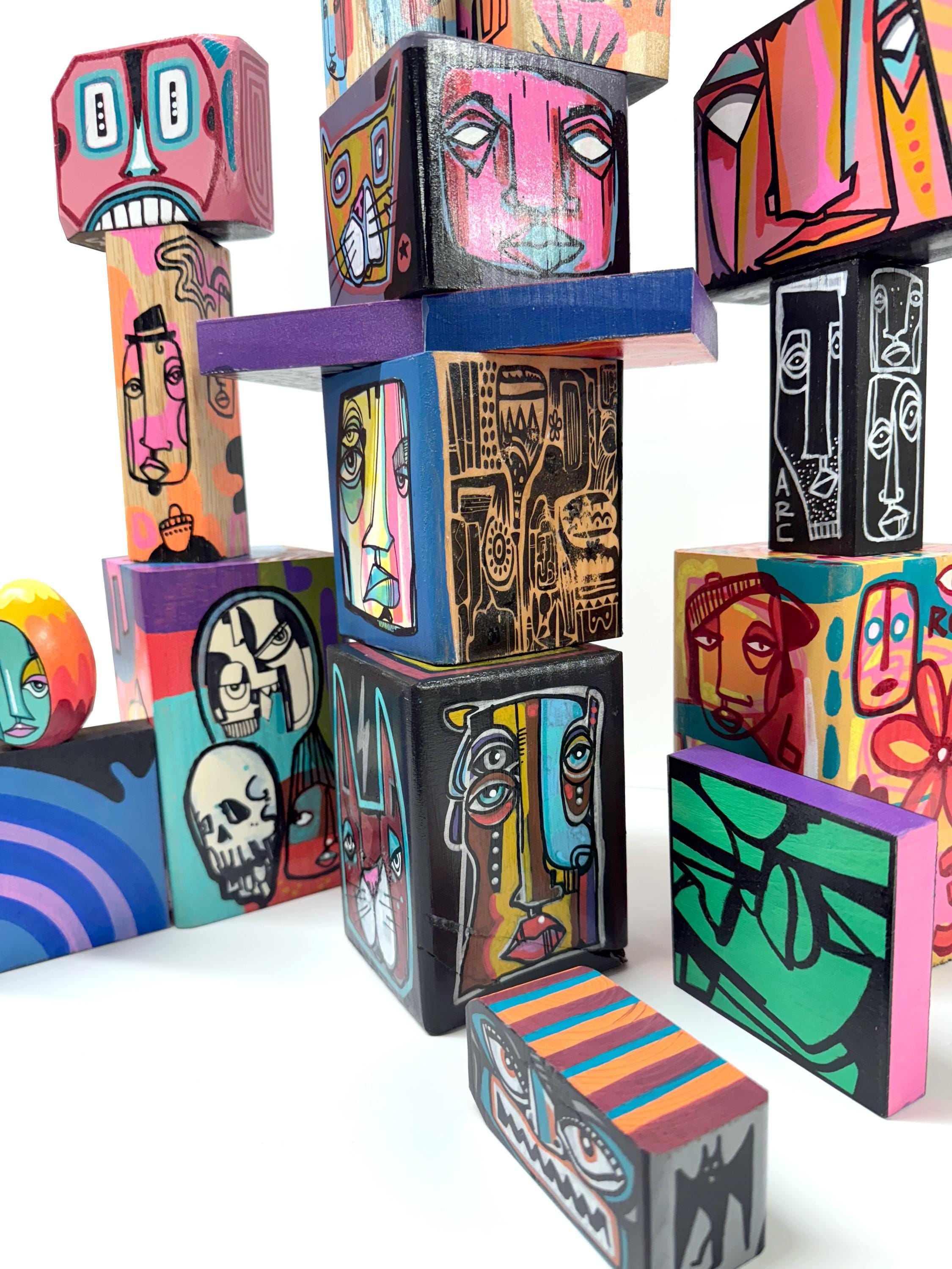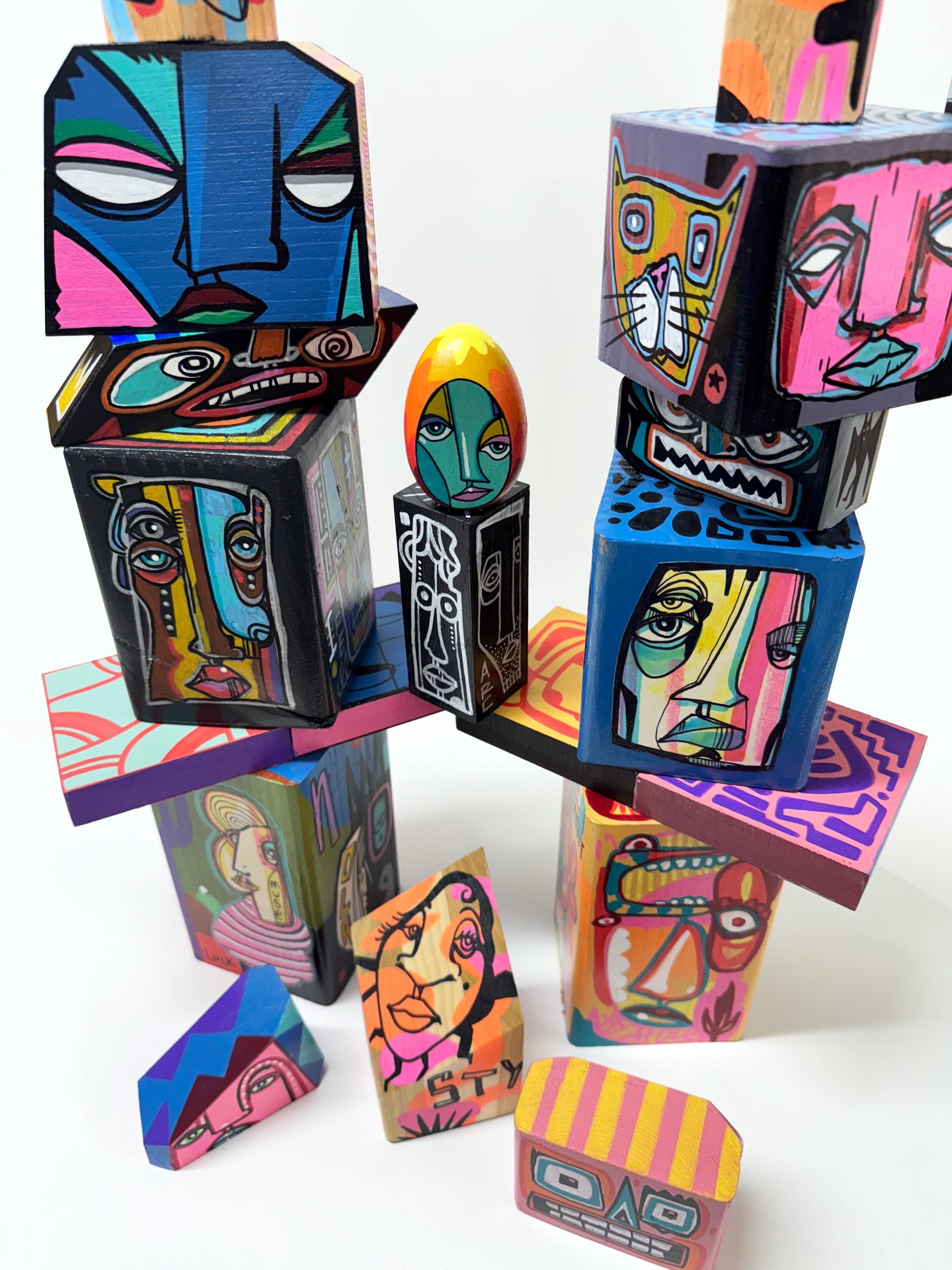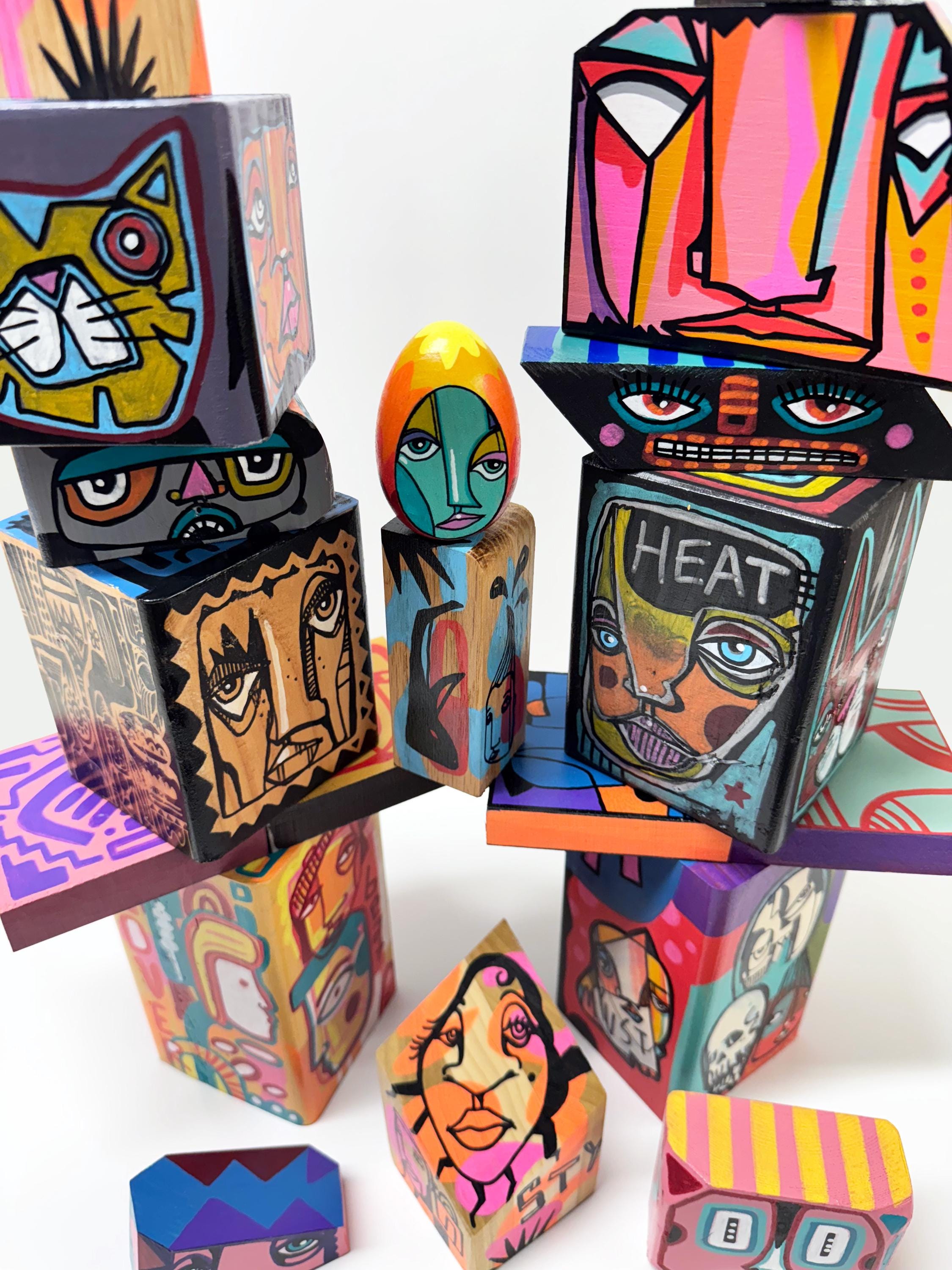 Funk Totem Parts are mixed media works of art on various sized wood blocks.