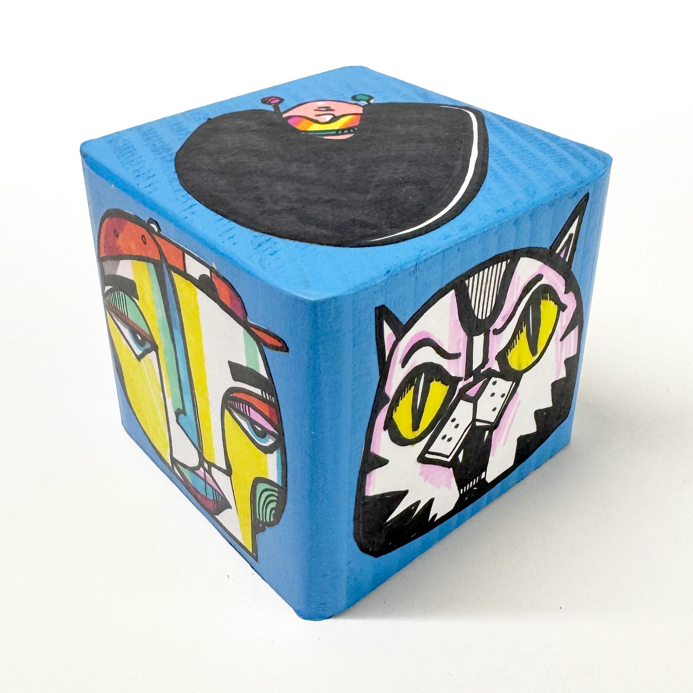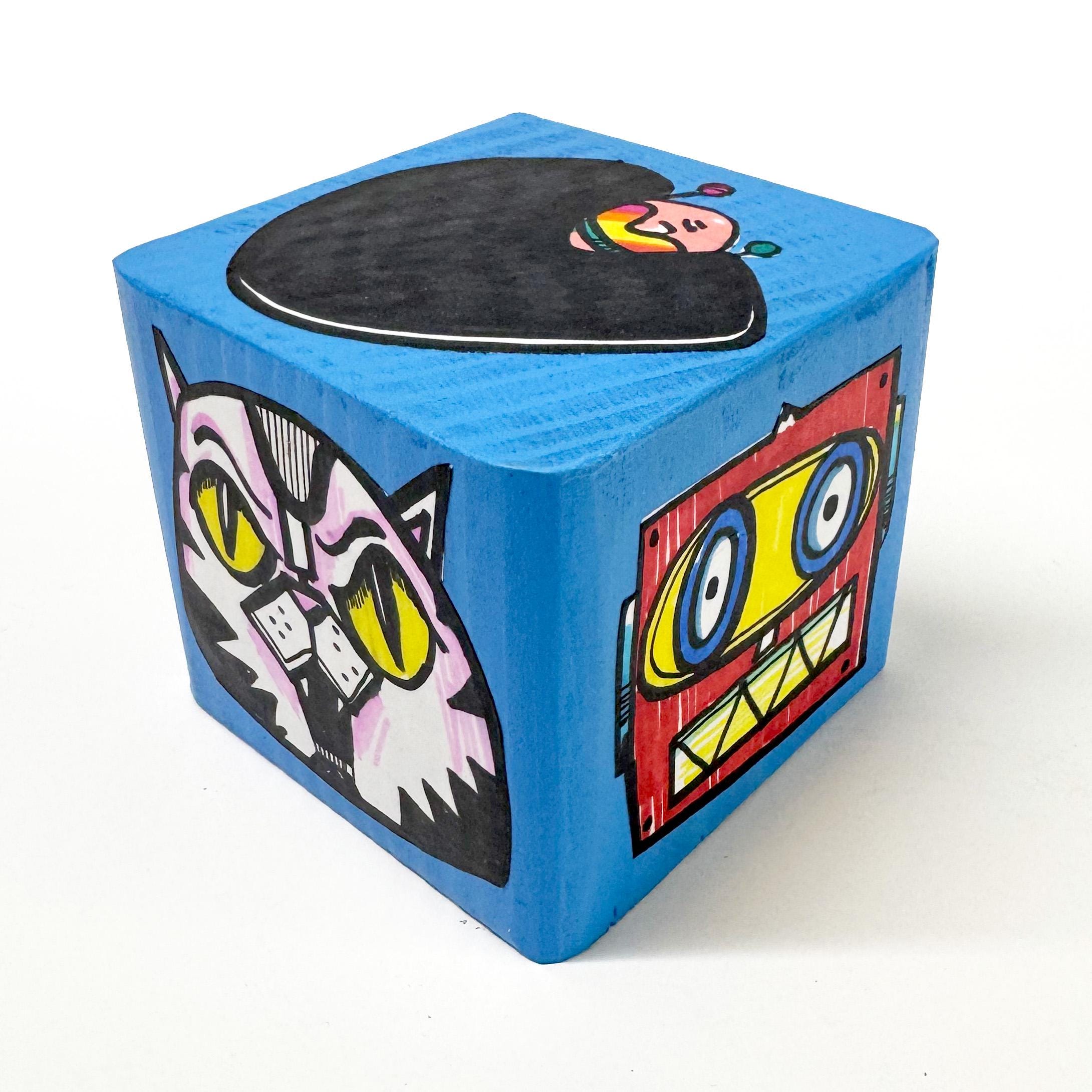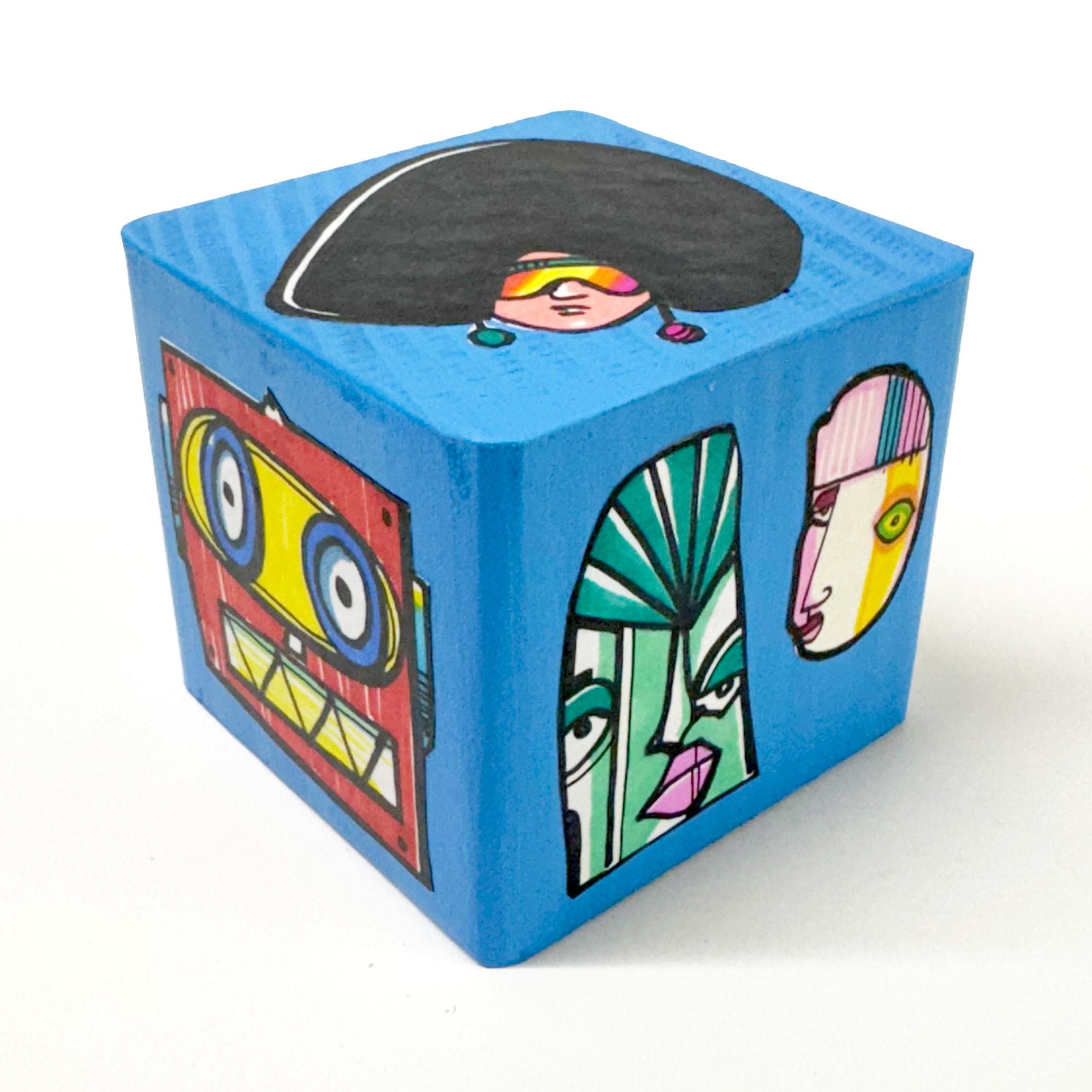 Funk Totem Parts are mixed media works of art on various sized wood blocks.