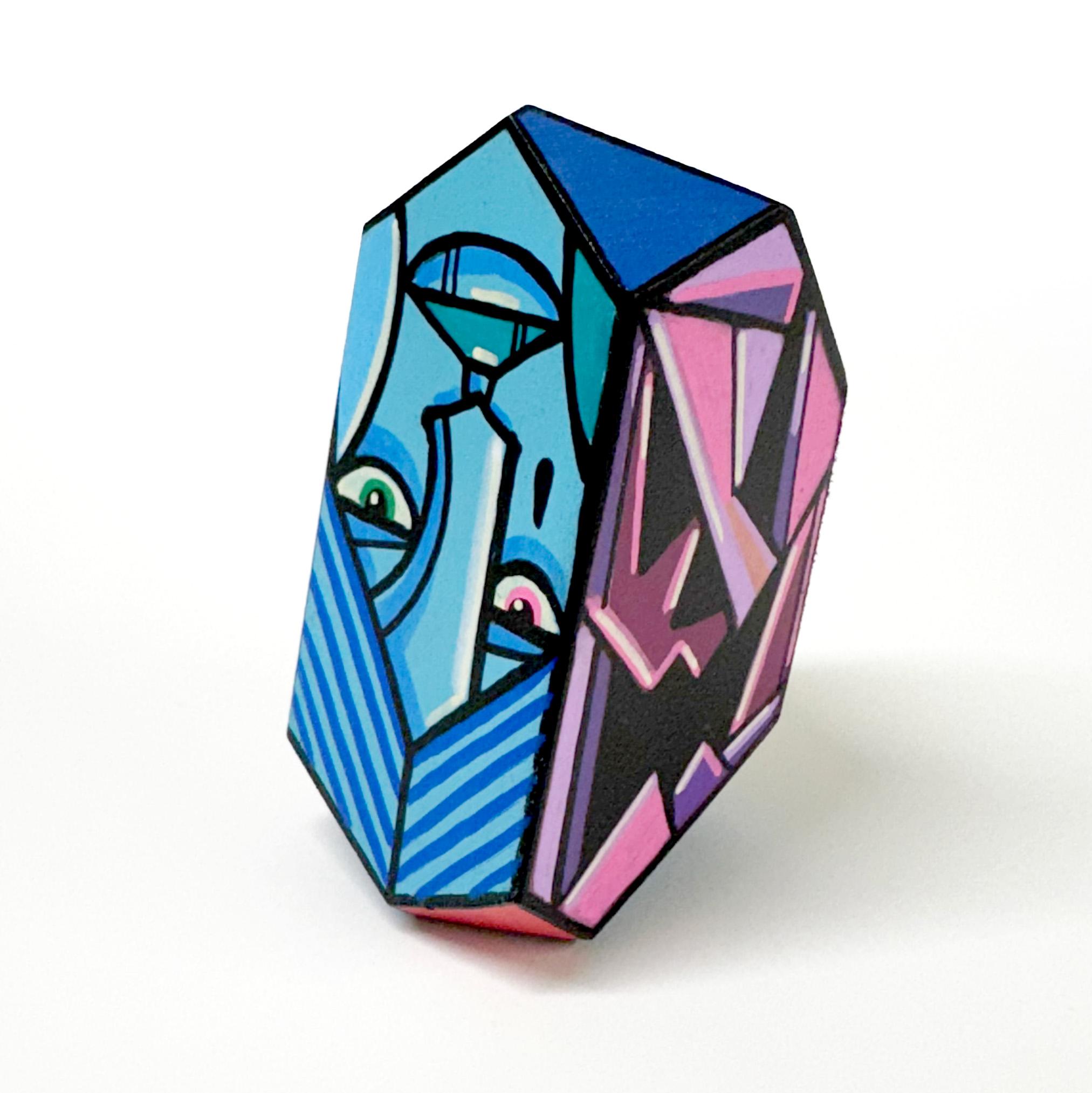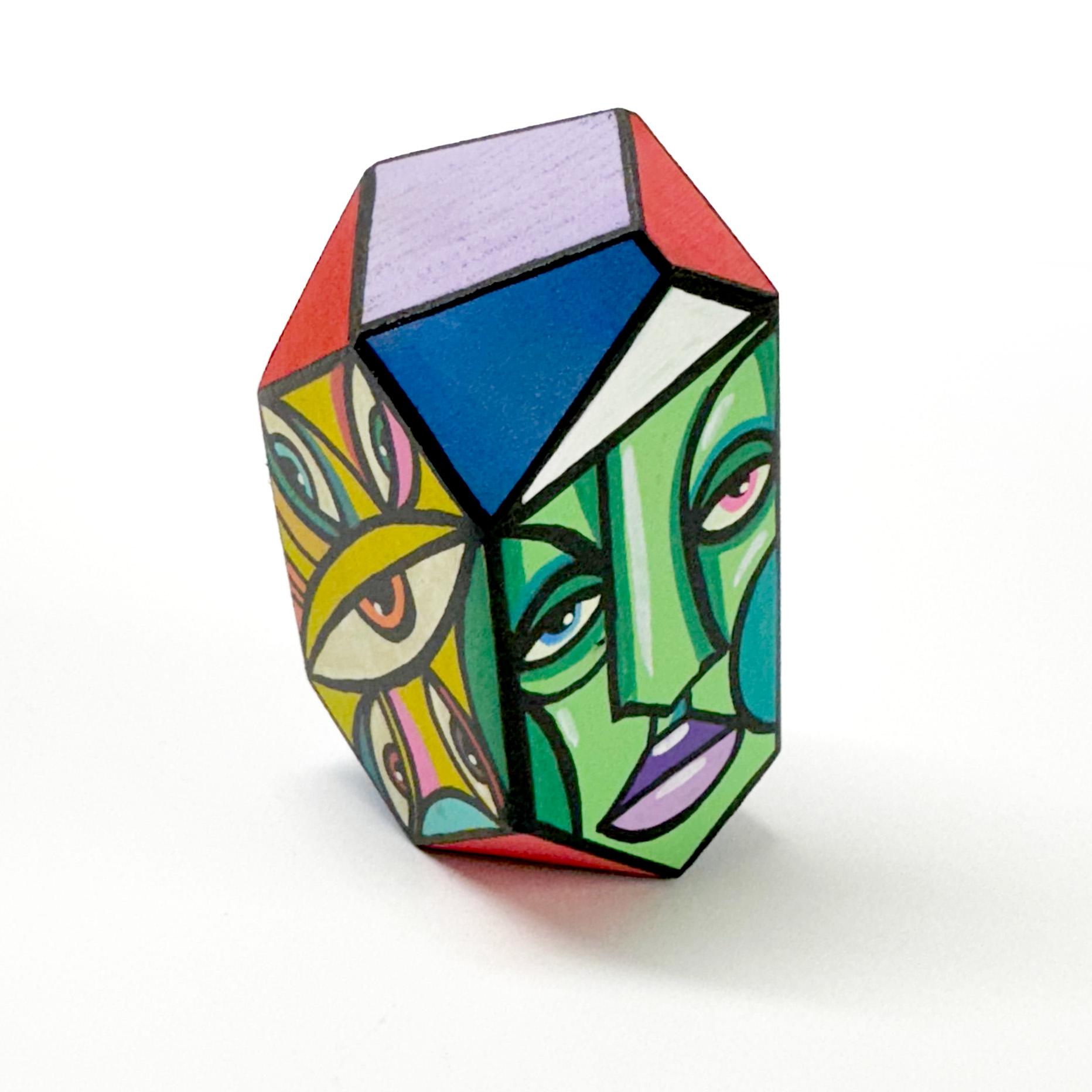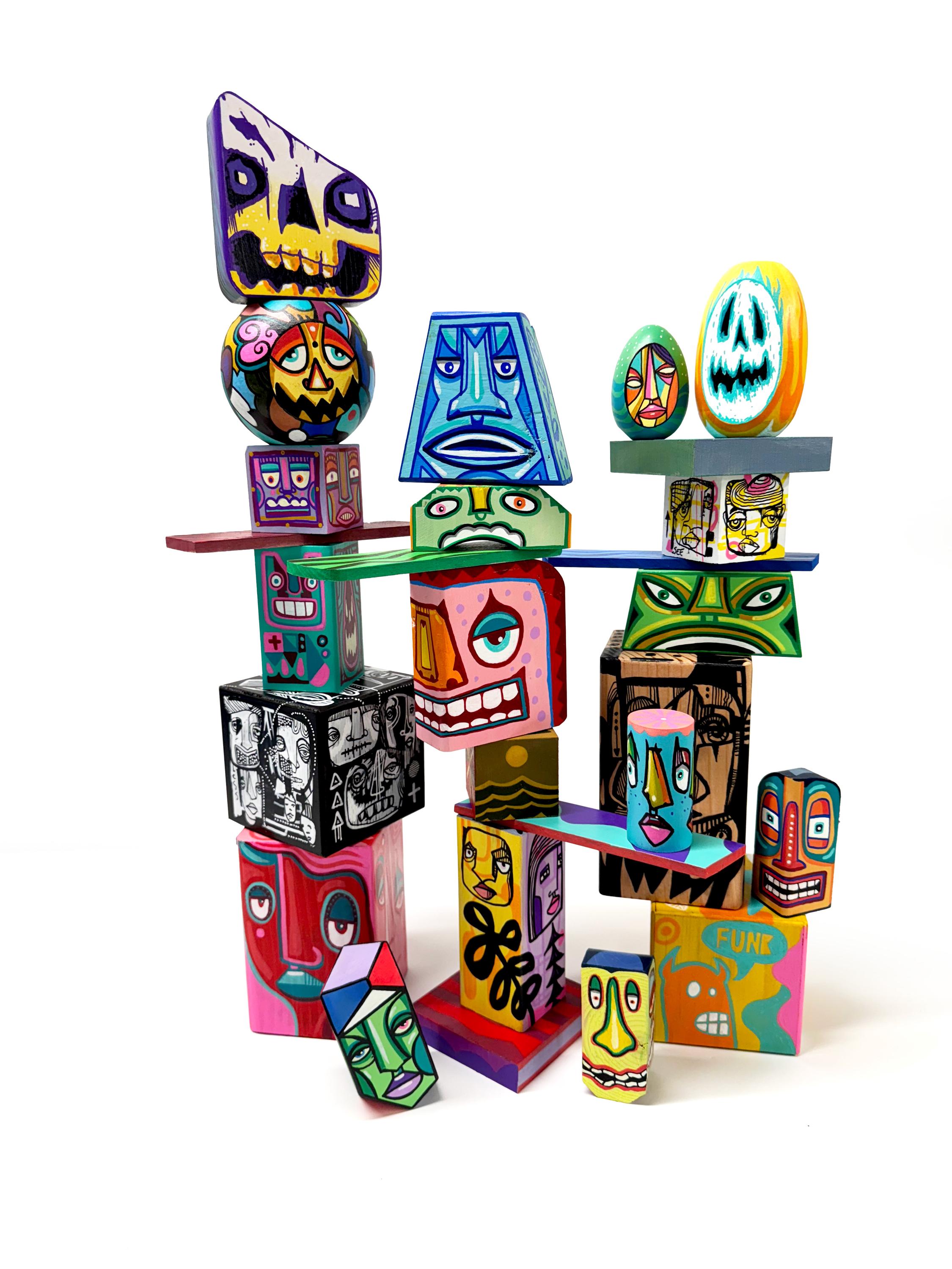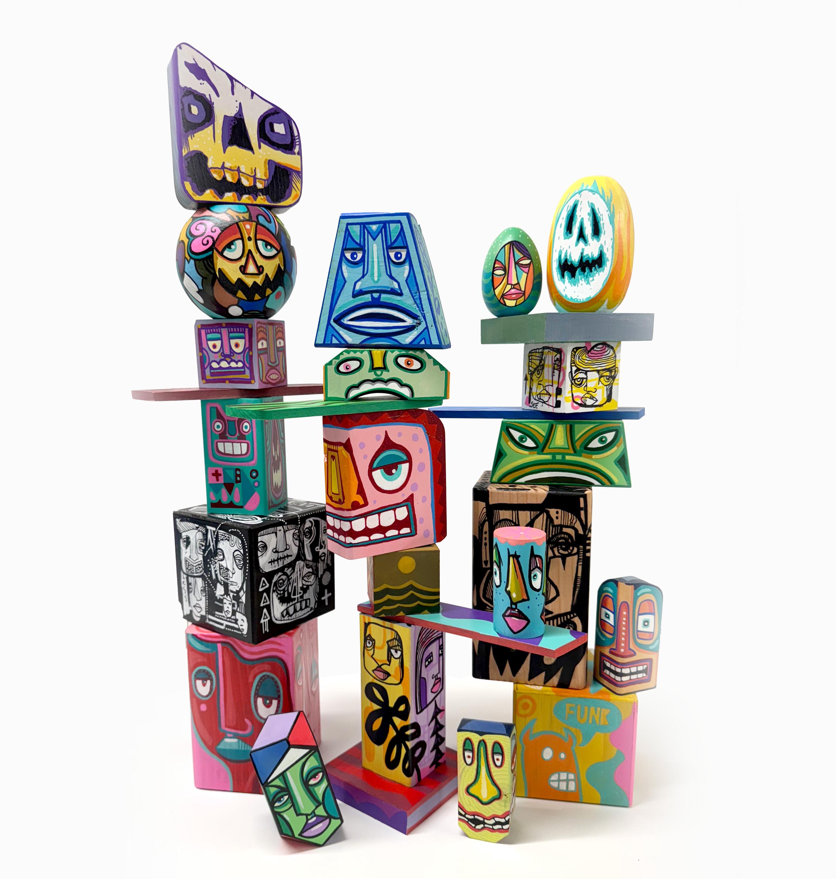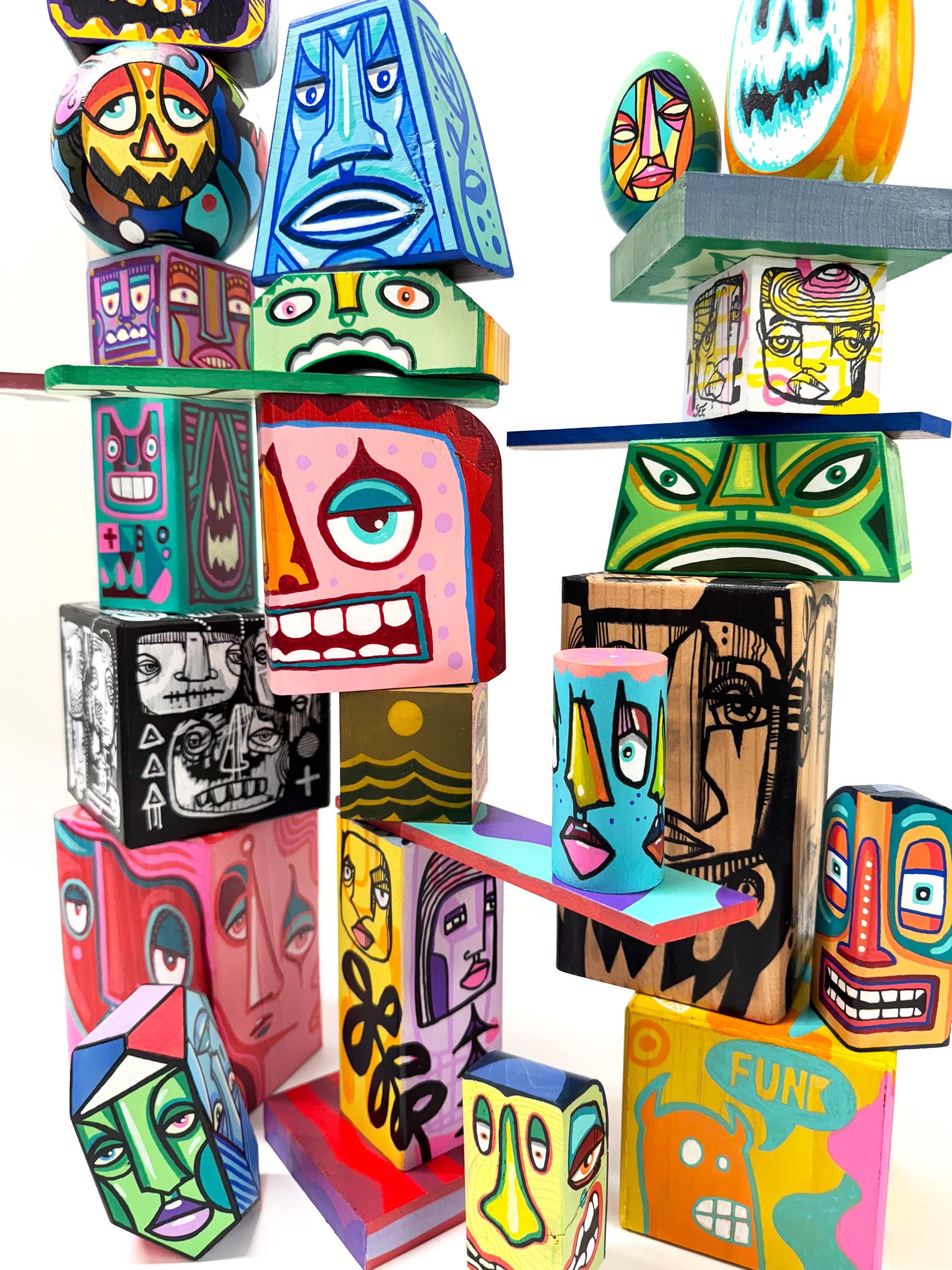 Funk Totem Parts are mixed media works of art on various sized wood blocks.