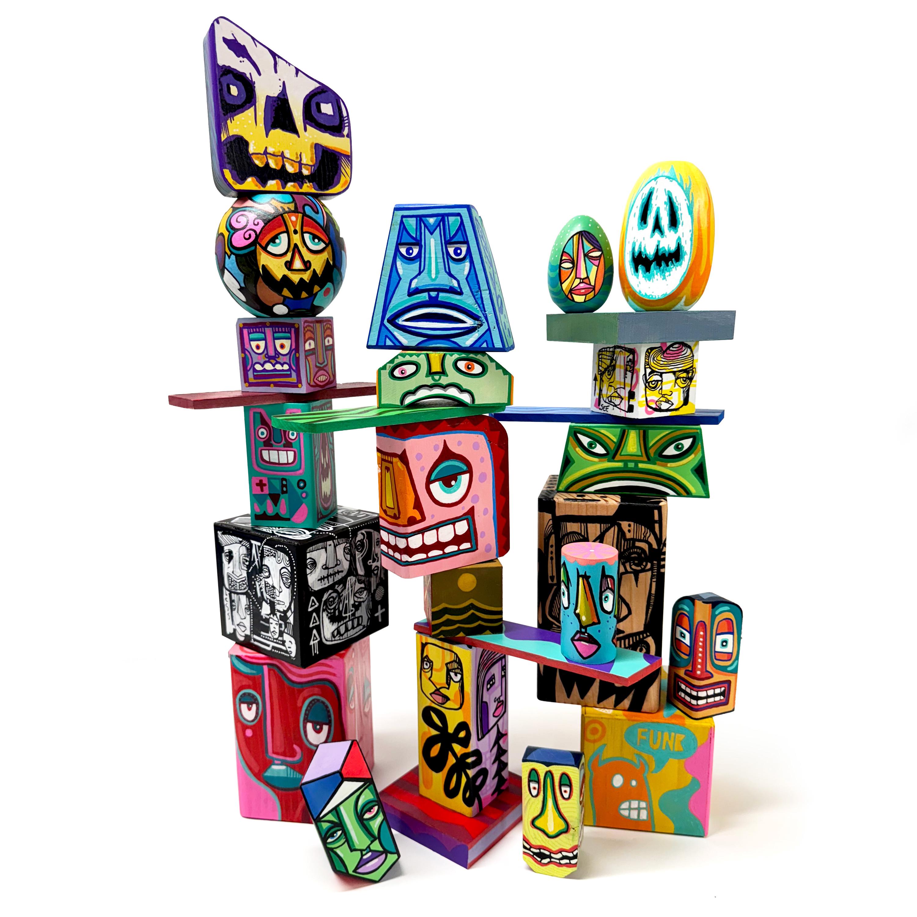 Funk Totem Parts are mixed media works of art on various sized wood blocks.