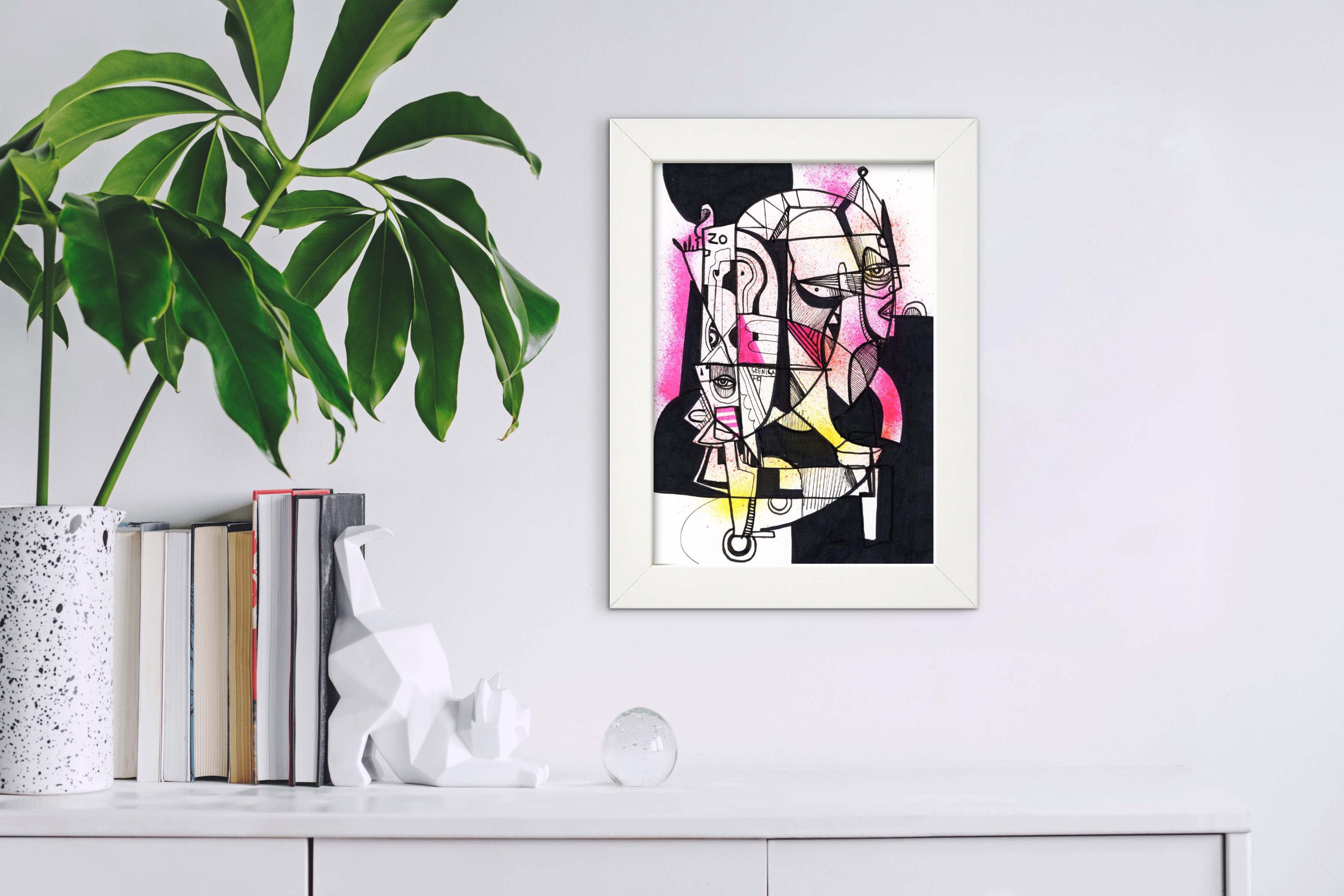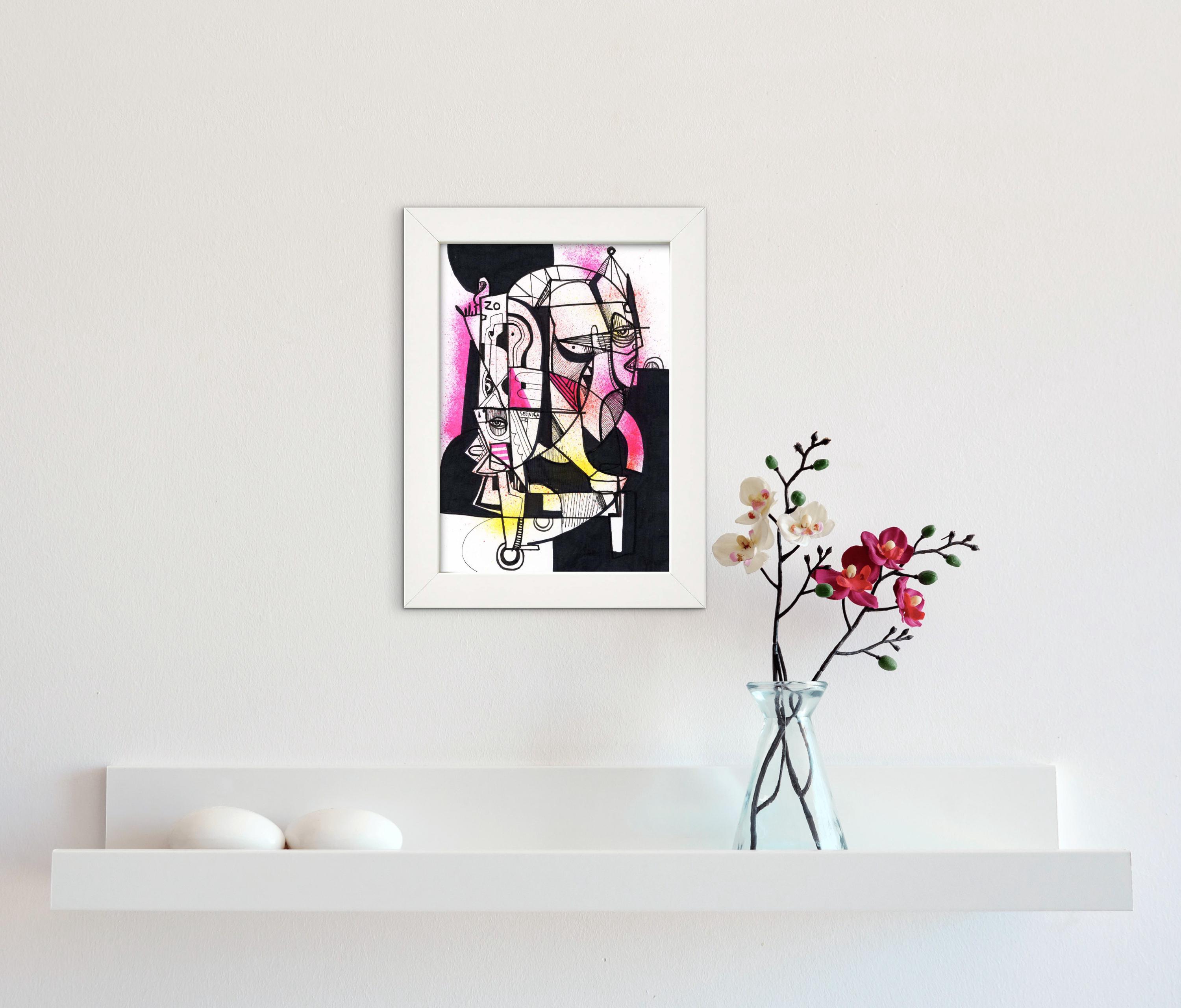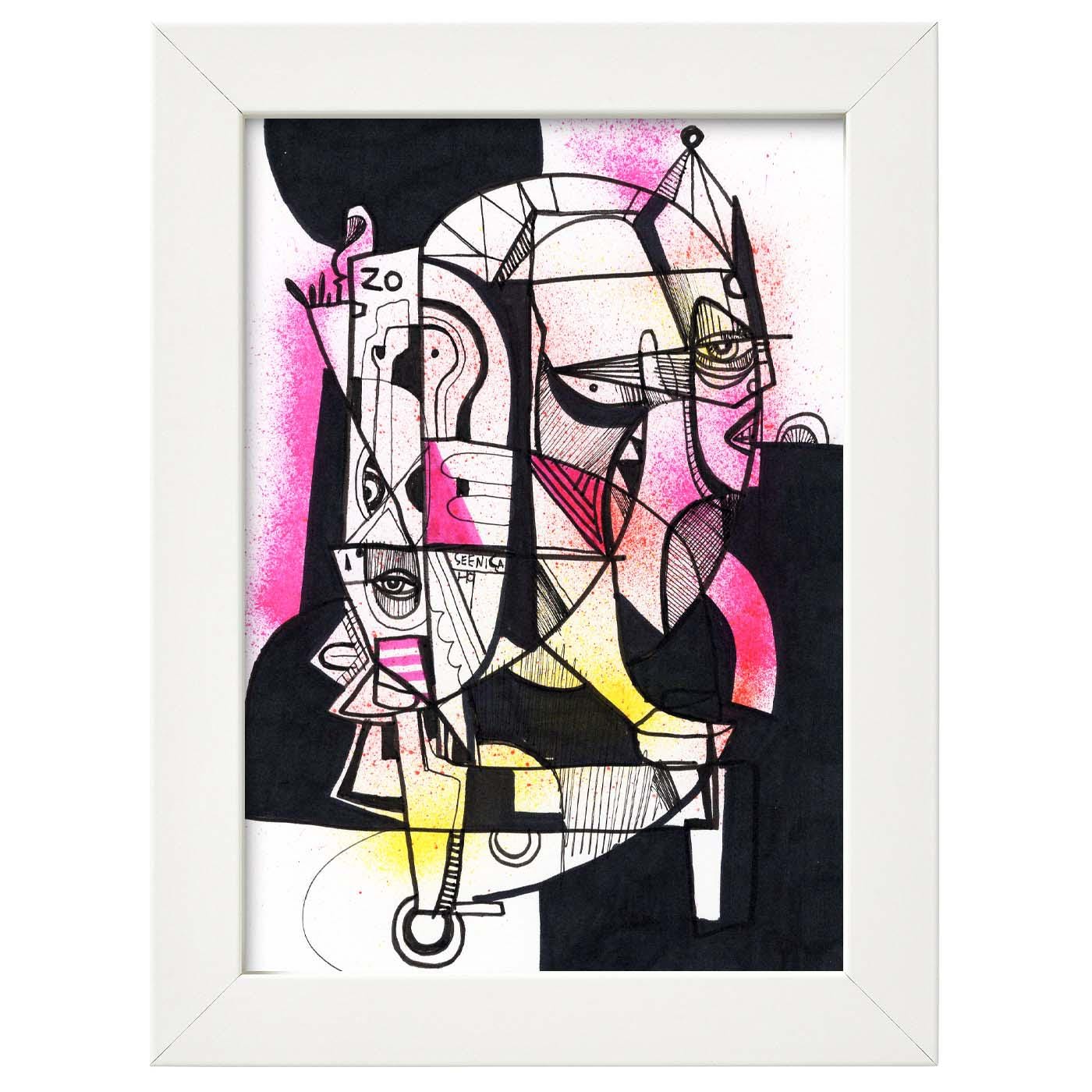 An original pen and ink drawing on bristol board framed in a borderless clip frame.