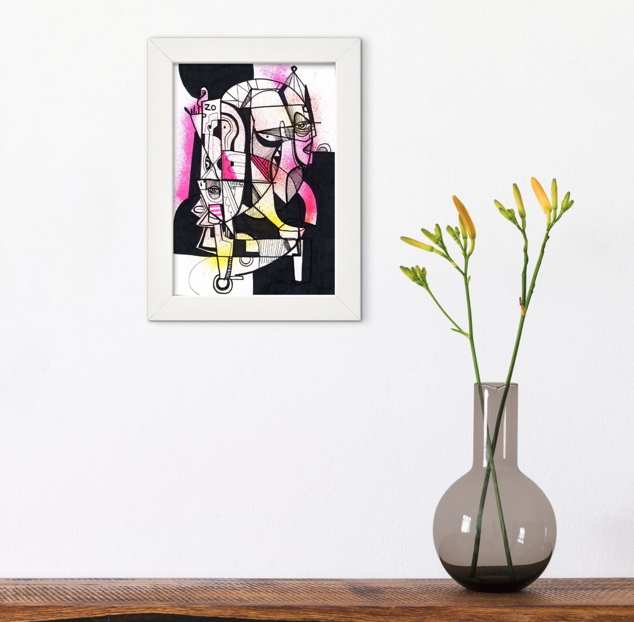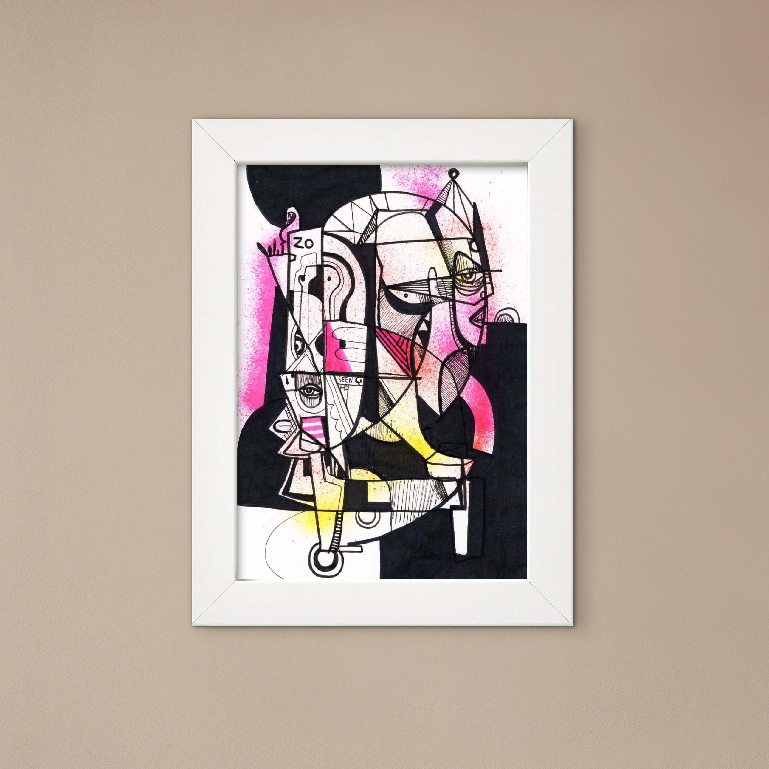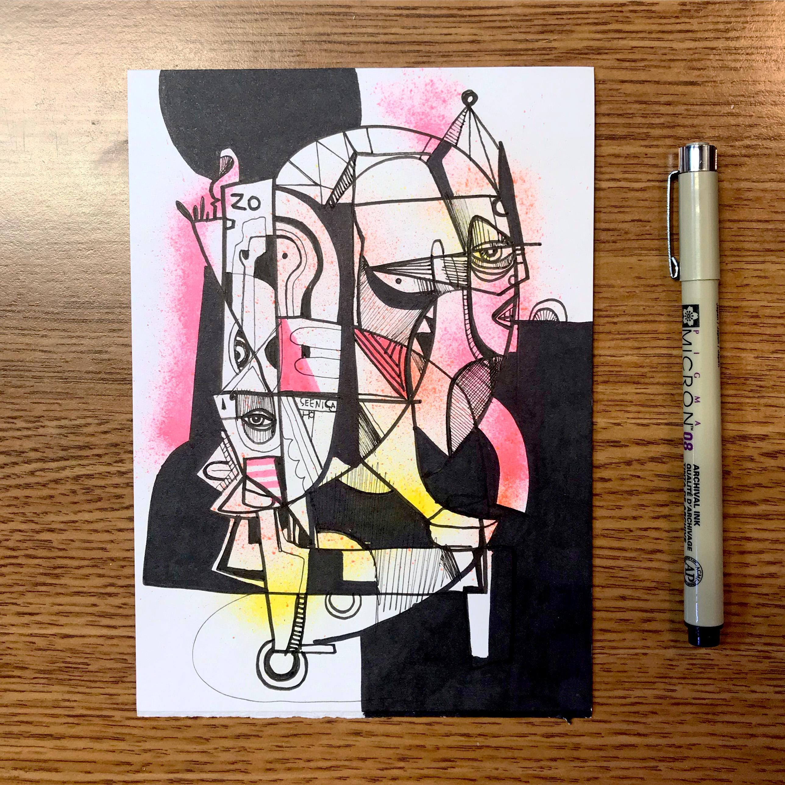 An original pen and ink drawing on bristol board framed in a borderless clip frame.