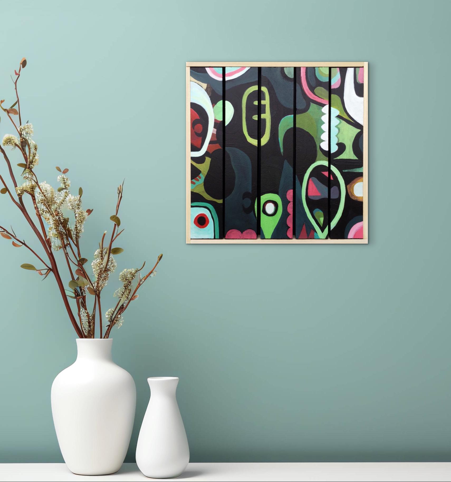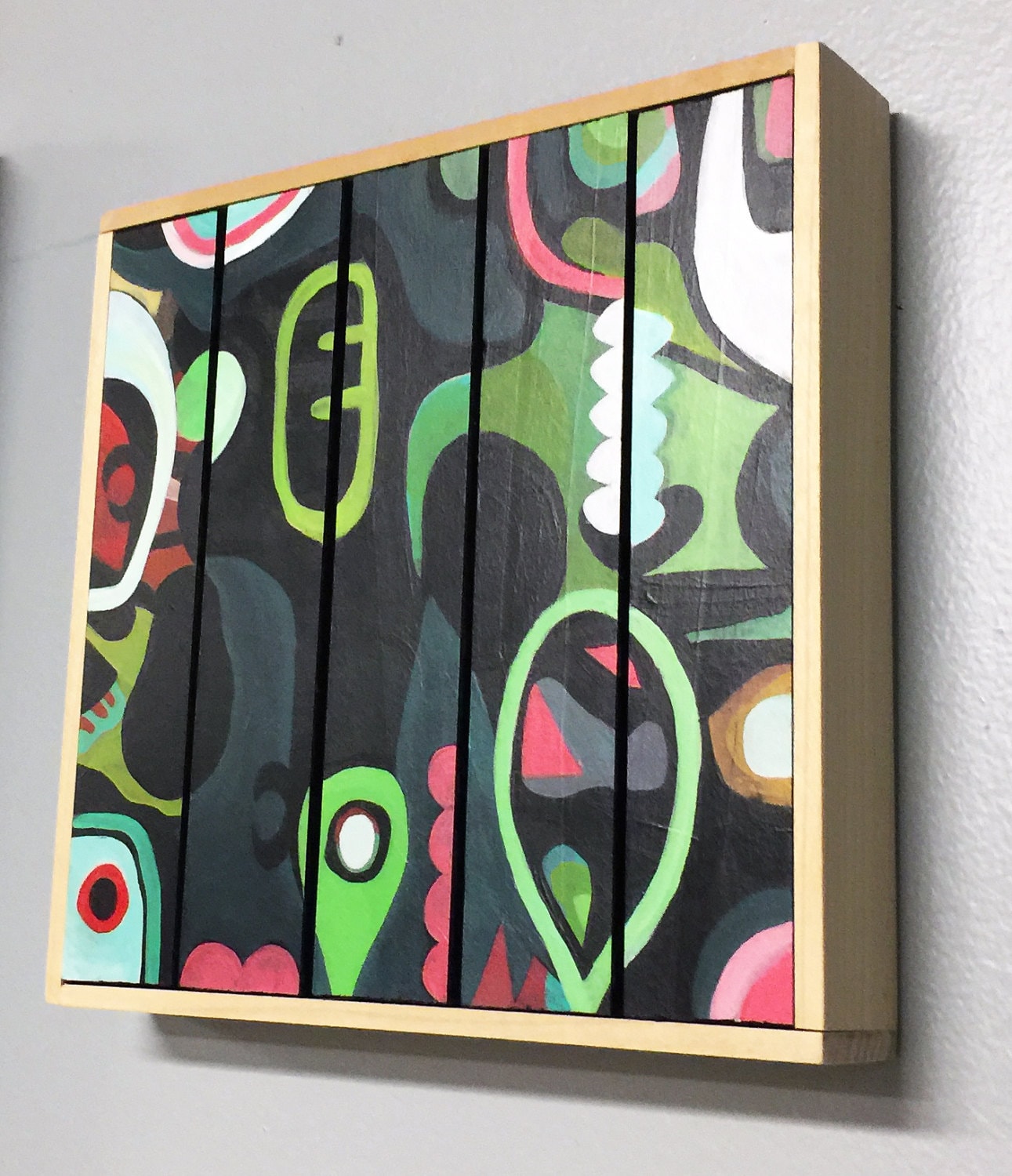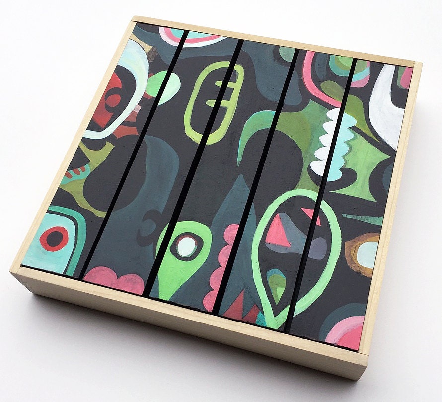 Original acrylic painting on wood slats mounted on 8" x 8" on wood panel