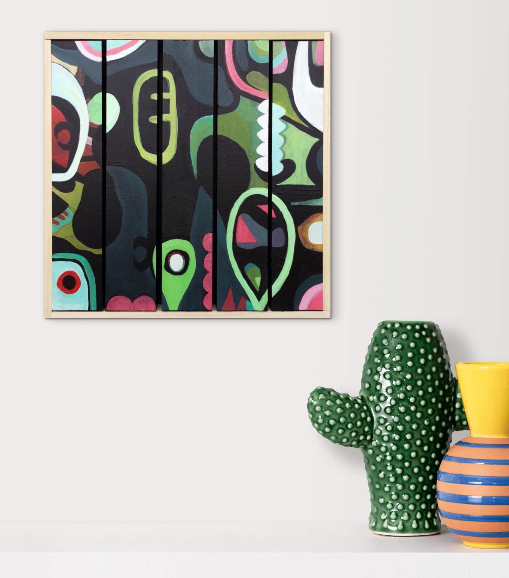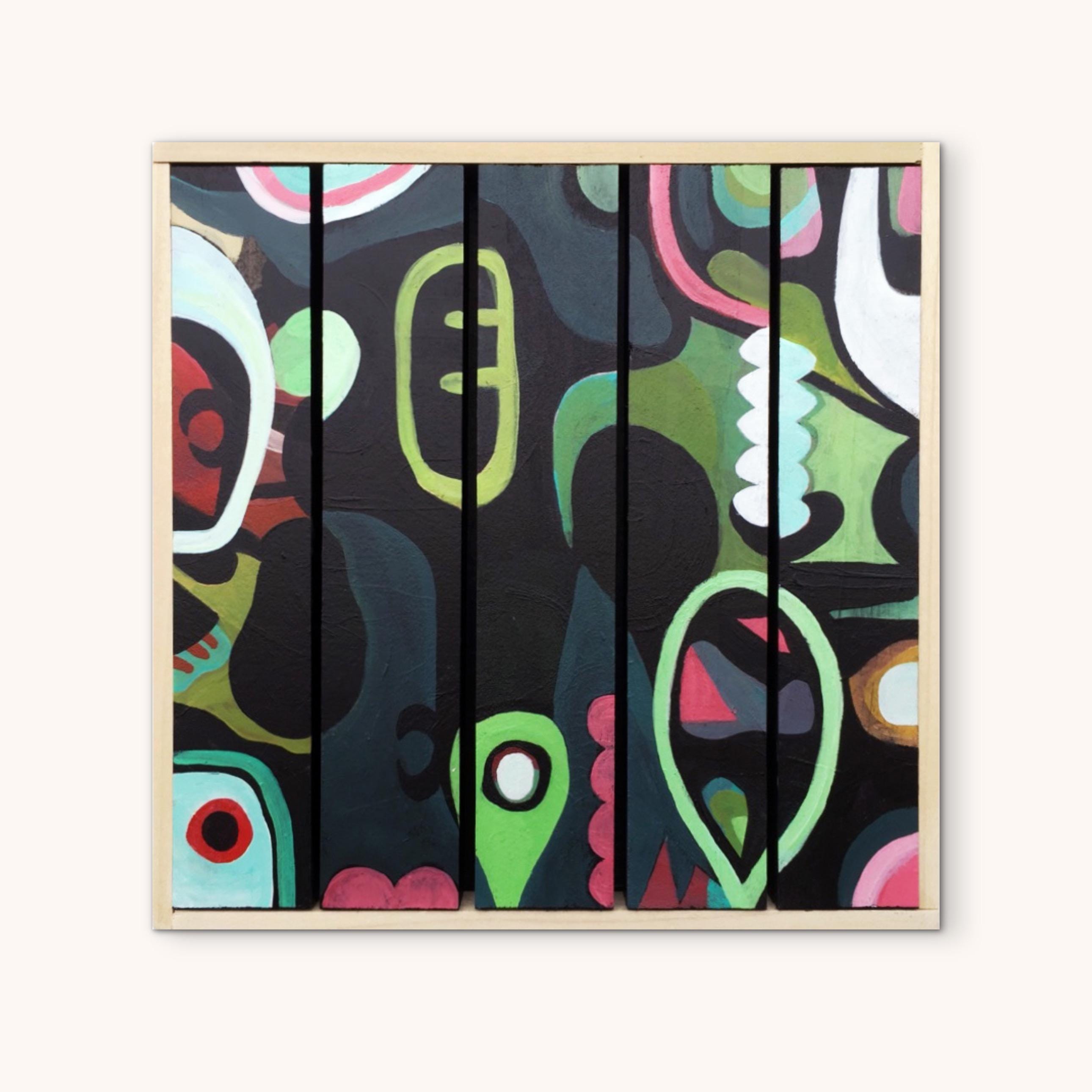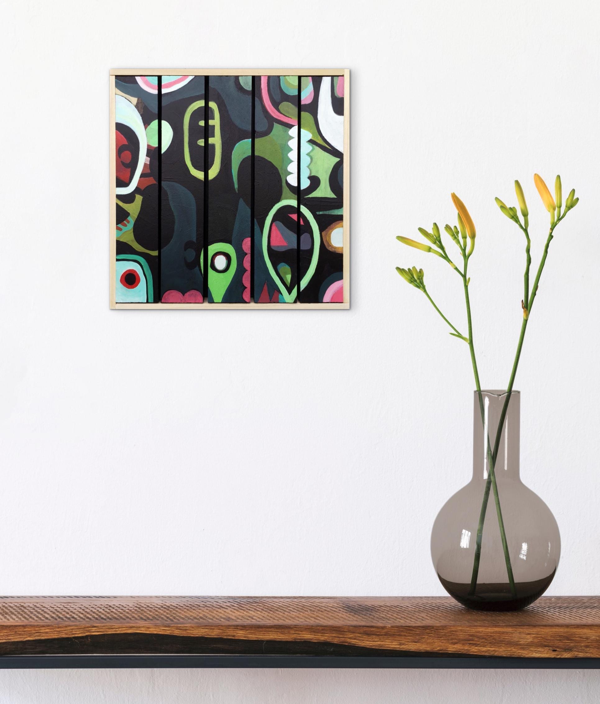 Original acrylic painting on wood slats mounted on 8" x 8" on wood panel
