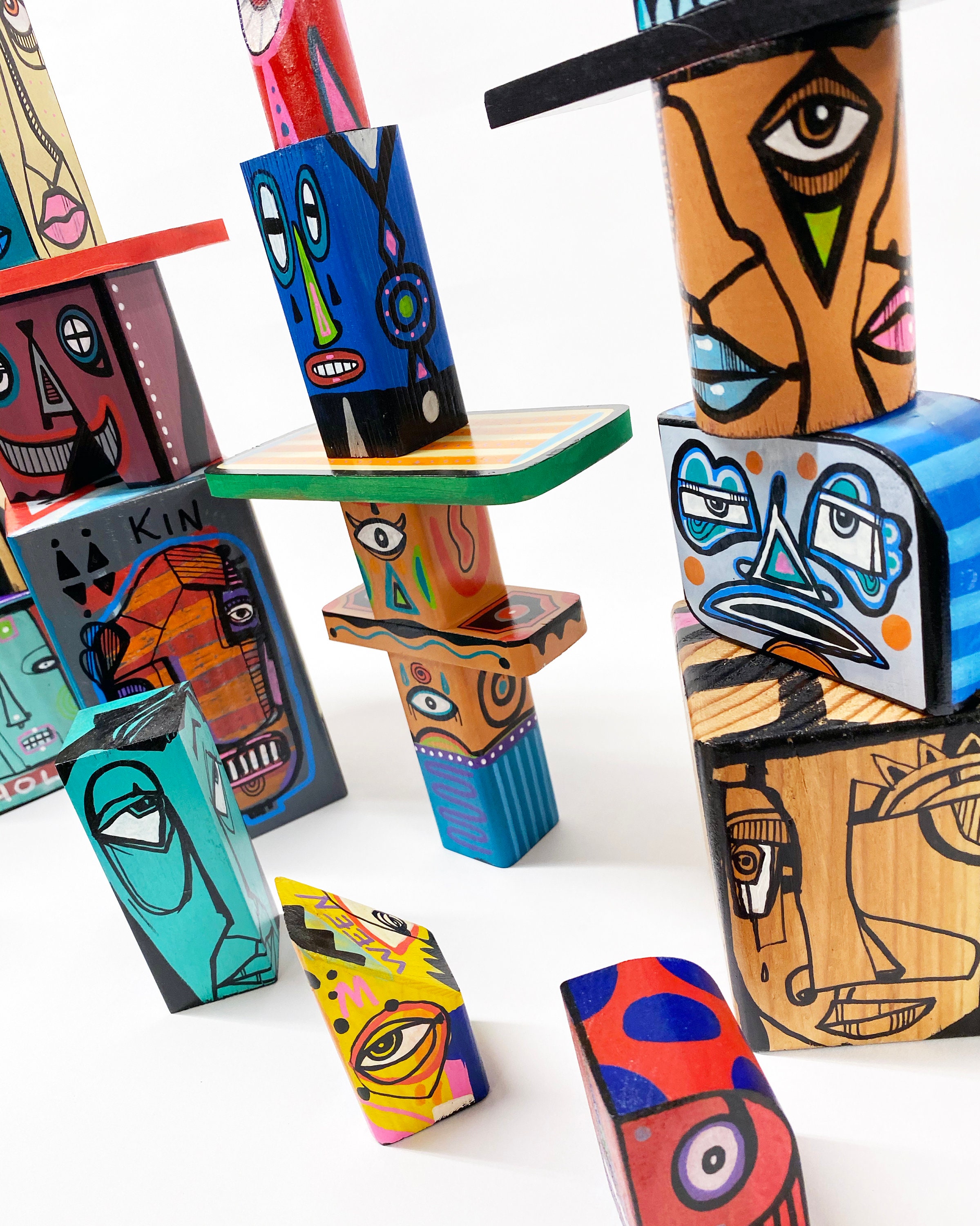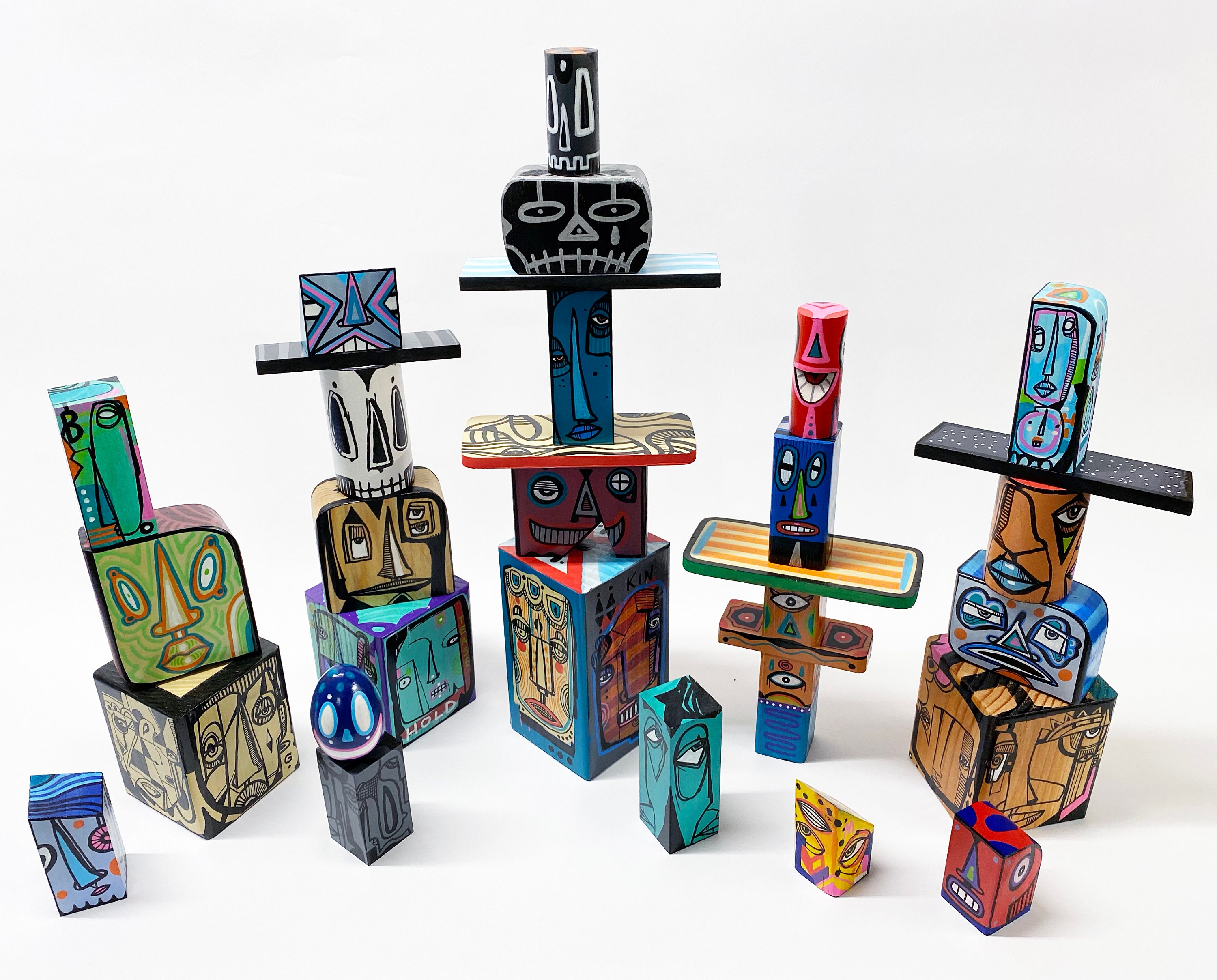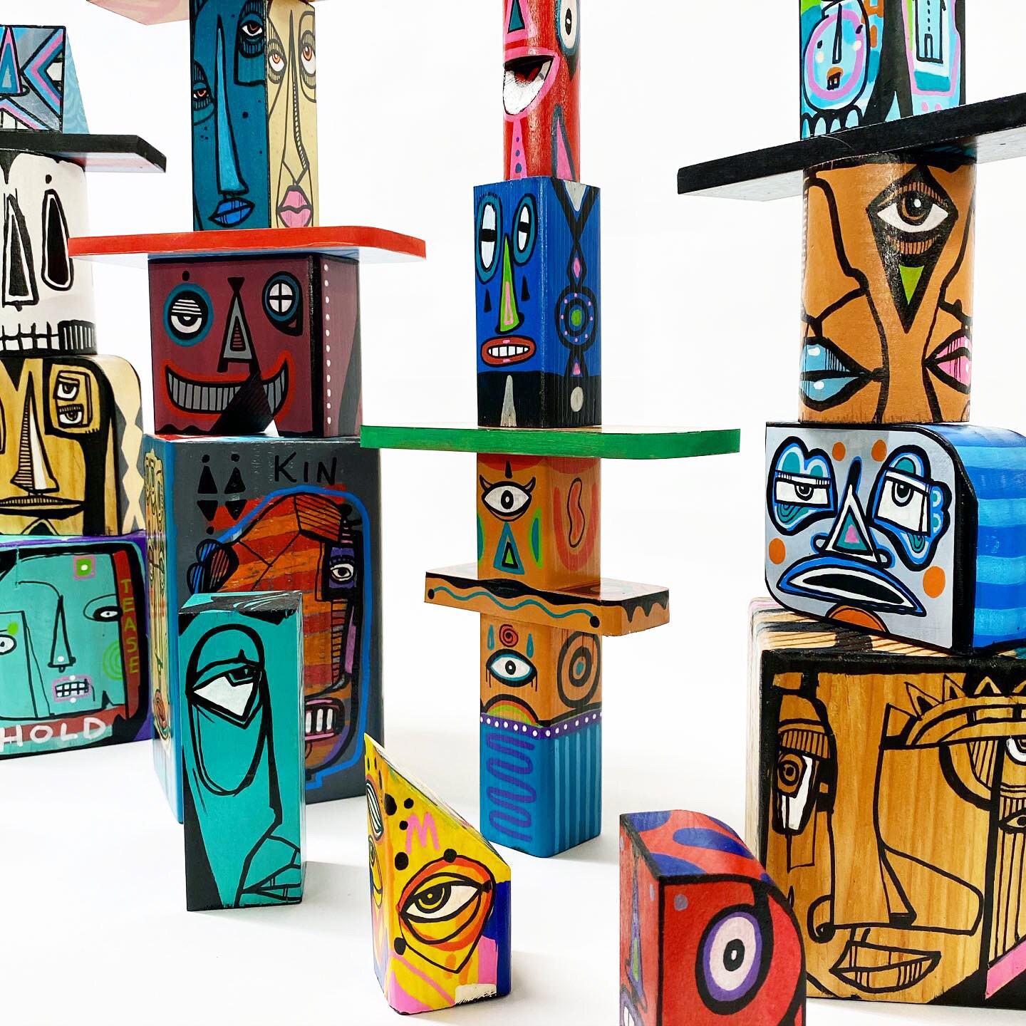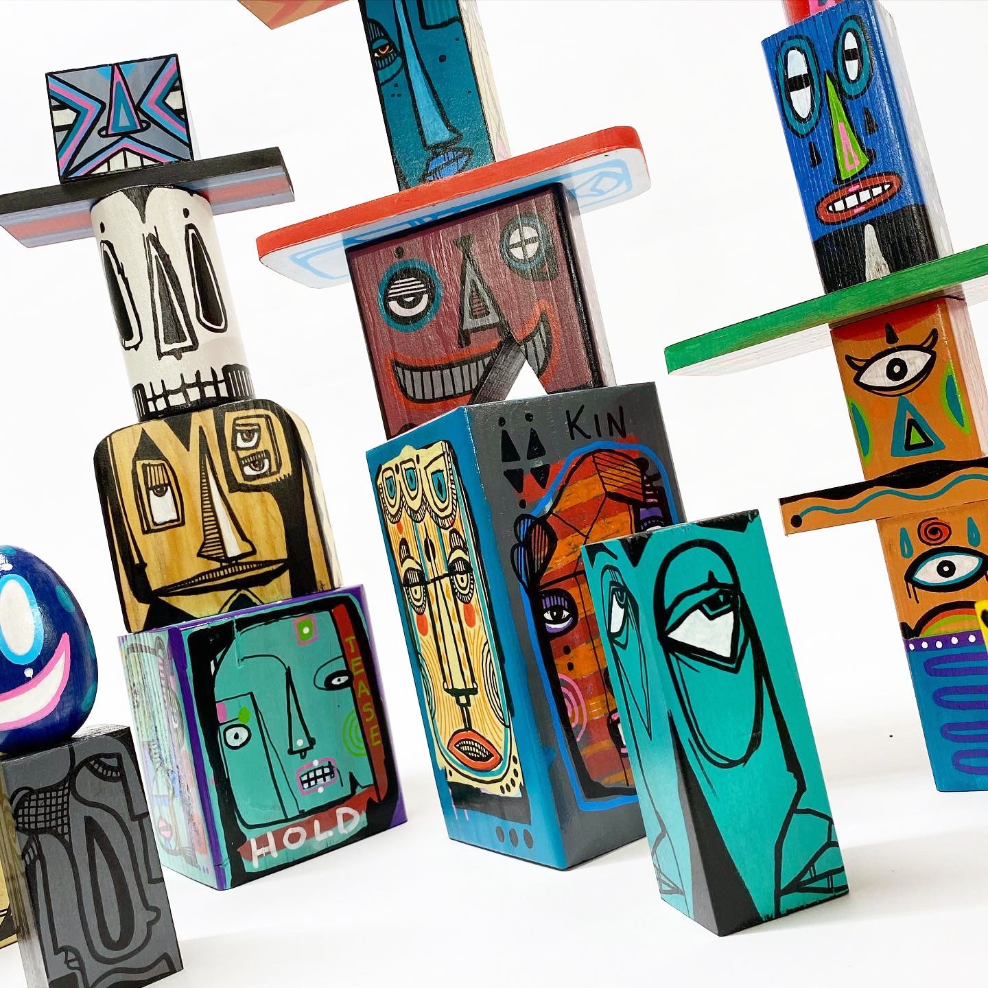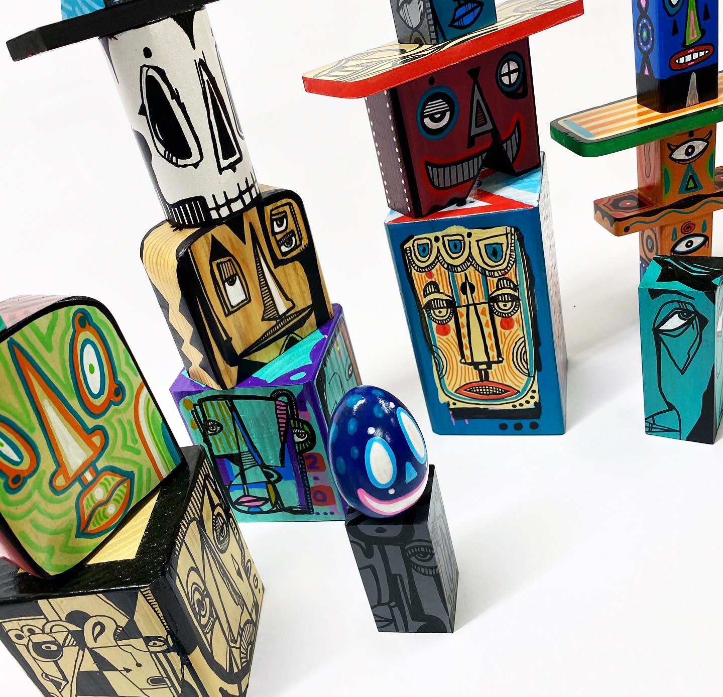 Funk Totem Parts are mixed media works of art on various sized wood blocks.